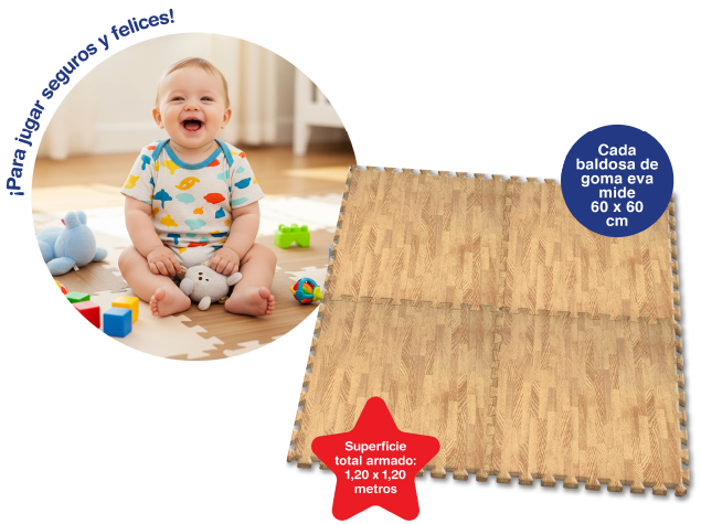 Baldosas encastrables, antideslizantes, antigolpes, aislantes térmicos. Fácil de limpiar. Espesor 12 mm. Superficie total armada 1,20 x 1,20 m.