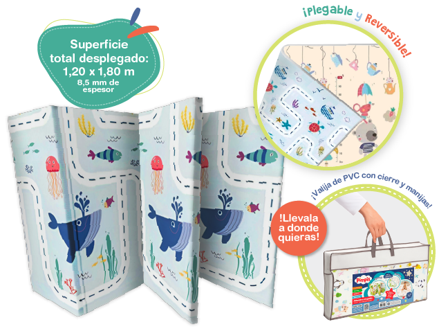 Alfombra acolchada, plegable y reversible, antigolpes, aislantes térmicos. Fácil de limpiar. En valija de PVC con cierre y manijas.