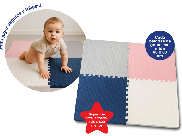 Baldosas encastrables, antideslizantes, antigolpes, aislantes térmicos. Fácil de limpiar. Espesor 12 mm. Superficie total armada 1,20 x 1,20 m.