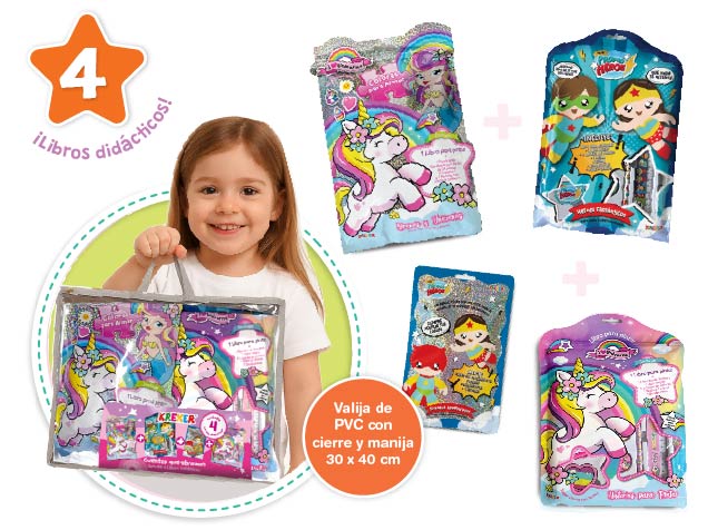 Incluye los siguientes juegos en una valija de pvc con cierre y manija:- Sirenas y Unicornios. - Historias para pintar. - Héroes fantásticos. - Cuentos asombrosos.