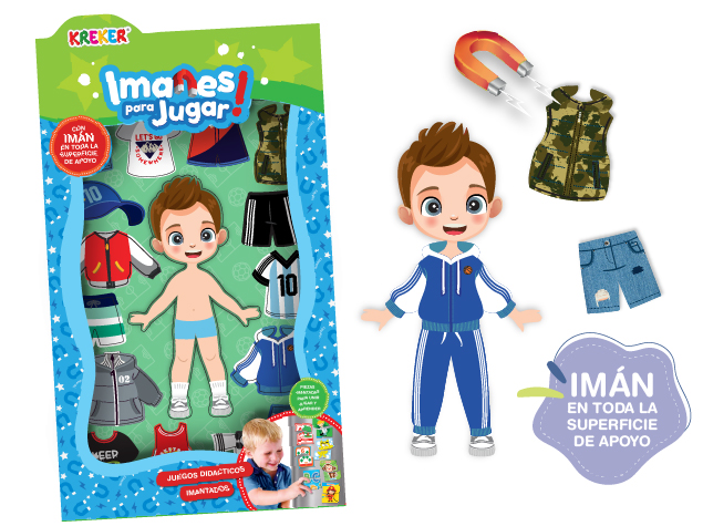 Incluye 1 figura de nene y 15 ropitas imantadas para armar los outfits quemás te gusten!.