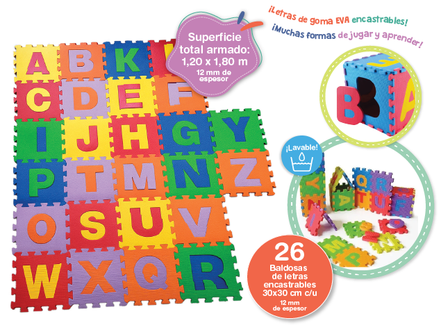 Baldosas encastrables, antideslizantes, antigolpes y aislantes térmicos. 26 pisos de goma EVA. Fácil de limpiar. Espesor 12 mm. Con Abecedario encastrable. Superficie total armada 1,20 x 1, 80 m.