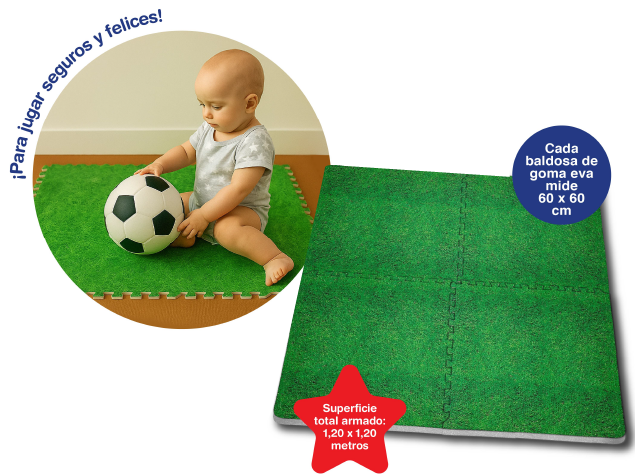 Baldosas encastrables, antideslizantes, antigolpes, aislantes térmicos. Fácil de limpiar. Espesor 12 mm. Superficie total armada 1,20 x 1,20 m.