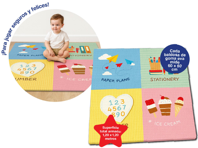Baldosas encastrables, antideslizantes, antigolpes, aislantes térmicos. Fácil de limpiar. Espesor 12 mm. Superficie total armada 1,20 x 1,20 m.