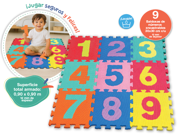 Baldosas encastrables, antideslizantes, antigolpes y aislantes térmicos. 9 pisos de goma EVA. Fácil de limpiar. Espesor 12 mm. Con números encastrables. Superficie total armada 0,90 x 0, 90 m
