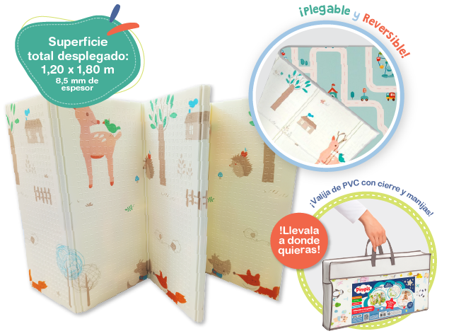 Alfombra acolchada, plegable y reversible, antigolpes, aislantes térmicos. Fácil de limpiar. En valija de PVC con cierre y manijas.