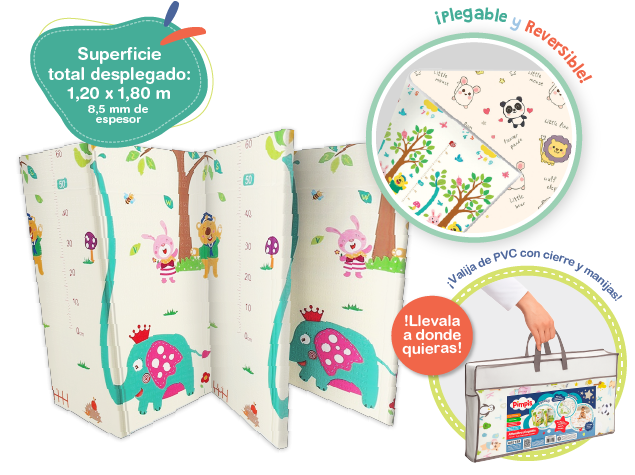 Alfombra acolchada, plegable y reversible, antigolpes, aislantes térmicos. Fácil de limpiar. En valija de PVC con cierre y manijas.