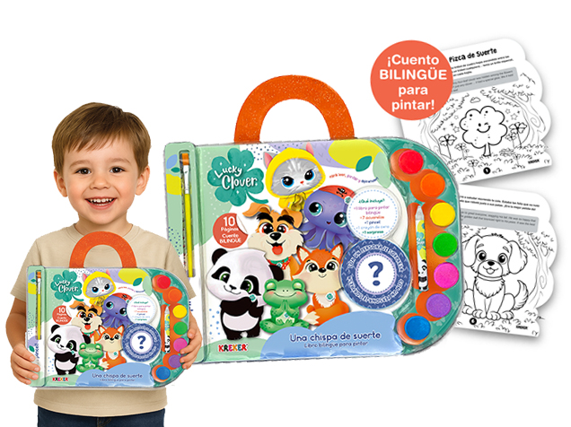 Incluye 1 libro de cuento para pintar,1 crayón de cera, 7 acuarelas, 1 pincel y 1 sorpresa.