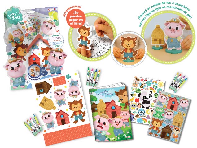 Incluye 1 libro de cuentos bilingüe para pintar, 12 crayones, 2 planchas de stickers y figuras de goma EVA autoadhesivas para armar o decorar.